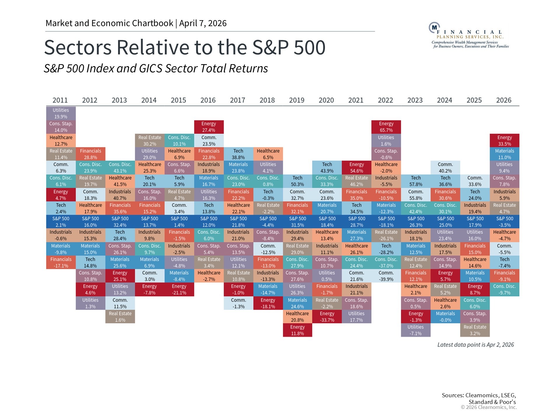 As always, it’s important to keep these moves in perspective. As the chart above shows, sector leadership can change based on market and economic conditions. Energy was the best performing sector in 2021 and 2022 when technology-related stocks struggled. This then reversed over the next three years. Just as with asset classes, it is extremely difficult to predict which sector will lead or lag in any given year, which is why a well-balanced portfolio is better positioned to weather different market environments.